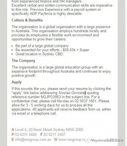 国际性教育机构,澳洲本题员工超过两千人。有很好的内部晋升机会,工作地点在悉尼市中心。公司所用Payroll系统是ADP Payforce。